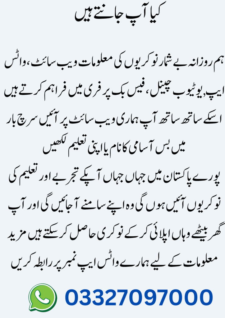 ”پاکستان بھر میں روزگار کے بہترین مواقع کی تلاش اب ہوئی انتہائی آسان۔ ہماری ویب سائٹ کا مقصد آپ کو سرکاری اور نجی شعبوں میں آنے والی تمام نئی ملازمتوں، اشتہارات اور اپلائی کرنے کے مکمل طریقہ کار سے بروقت باخبر رکھنا ہے۔ مستند معلومات اور روزانہ کی بنیاد پر جاب اپڈیٹس براہِ راست اپنے موبائل پر حاصل کرنے کے لیے ہمارے آفیشل واٹس ایپ نمبر 03327097000 پر رابطہ کریں اور اپنے روشن مستقبل کی جانب پہلا قدم بڑھائیں۔”