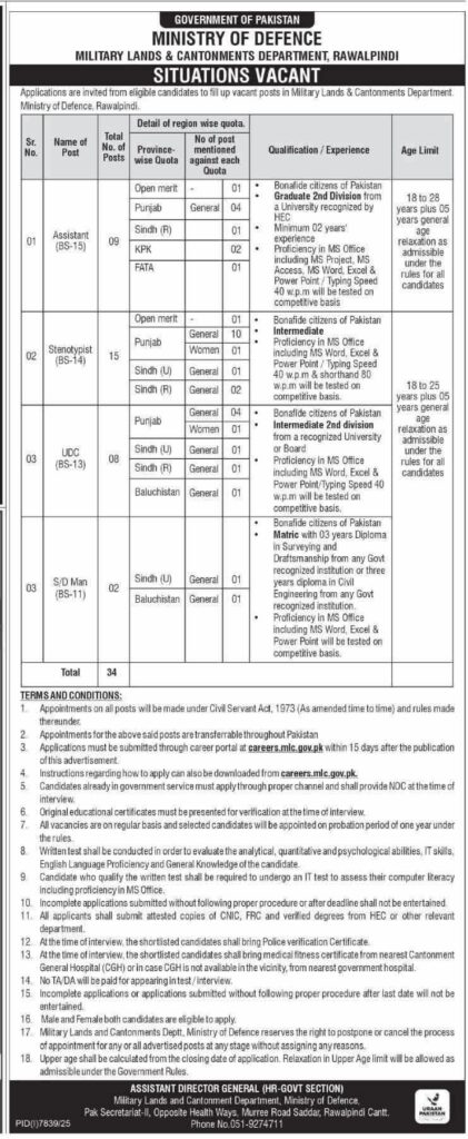 Military Lands & Cantonments Department, RawalpindiAssistant (BS-15)Stenotypist (BS-14)Upper Division Clerk – UDC (BS-13)S/D Man (BS-11)